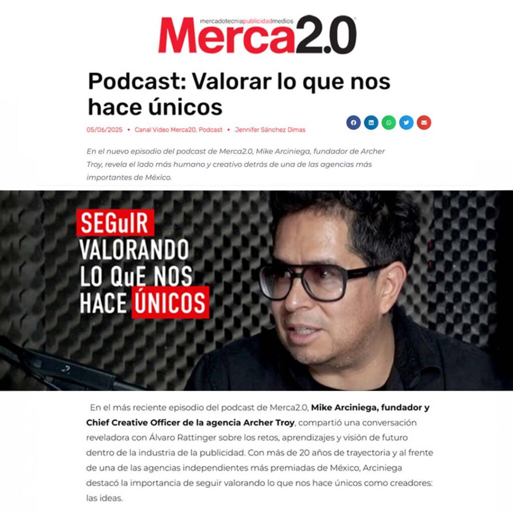 En el más reciente episodio del podcast de Merca2.0, Mike Arciniega, fundador y Chief Creative Officer de la agencia Archer Troy, compartió una conversación reveladora con Álvaro Rattinger sobre los retos, aprendizajes y visión de futuro dentro de la industria de la publicidad. Con más de 20 años de trayectoria y al frente de una de las agencias independientes más premiadas de México, Arciniega destacó la importancia de seguir valorando lo que nos hace únicos como creadores: las ideas.
