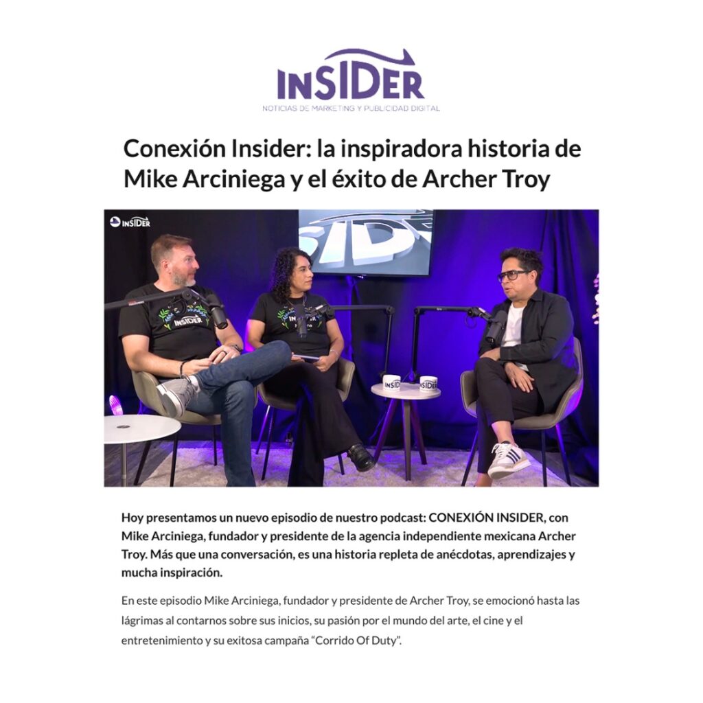 En este episodio Mike Arciniega, fundador y presidente de Archer Troy, se emocionó hasta las lágrimas al contarnos sobre sus inicios, su pasión por el mundo del arte, el cine y el entretenimiento y su exitosa campaña “Corrido Of Duty”. Mike nos contó cómo desde pequeño tenía la inquietud de dibujar, de crear; y aunque no sabía muy bien cómo canalizar ese talento, poco a poco fue construyendo una valiosa trayectoria que lo acercó siempre al mundo de la publicidad y la creatividad.