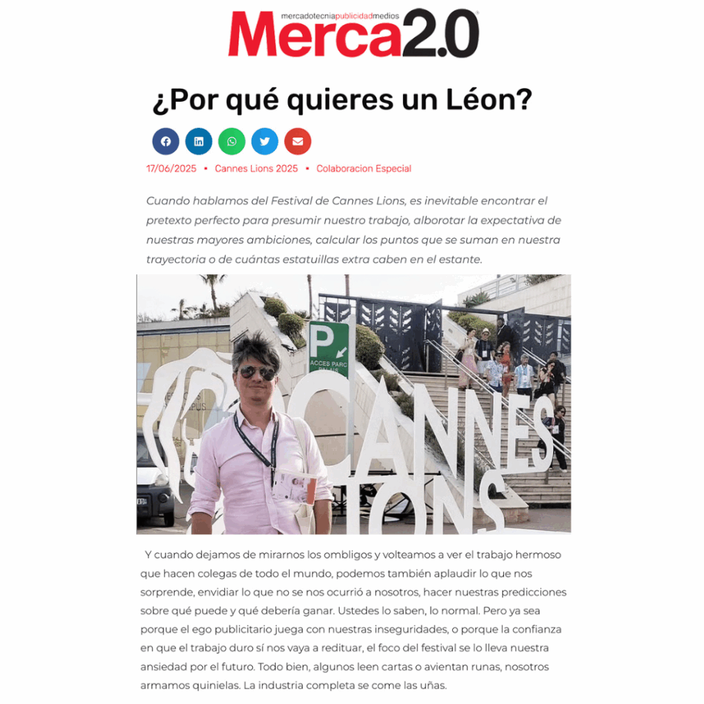 Cuando hablamos del Festival de Cannes Lions, es inevitable encontrar el pretexto perfecto para presumir nuestro trabajo, alborotar la expectativa de nuestras mayores ambiciones, calcular los puntos que se suman en nuestra trayectoria o de cuántas estatuillas extra caben en el estante. Y cuando dejamos de mirarnos los ombligos y volteamos a ver el trabajo hermoso que hacen colegas de todo el mundo, podemos también aplaudir lo que nos sorprende, envidiar lo que no se nos ocurrió a nosotros, hacer nuestras predicciones sobre qué puede y qué debería ganar.